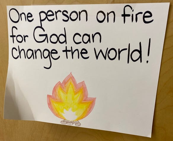 The image below presents a simple yet powerful statement: “One person on fire for God can change the world!” It’s accompanied by a vibrant, hand-drawn illustration of a flame. This visualization captures the essence of the message. Fire is powerful; it spreads, it transforms, and it brings light and warmth.